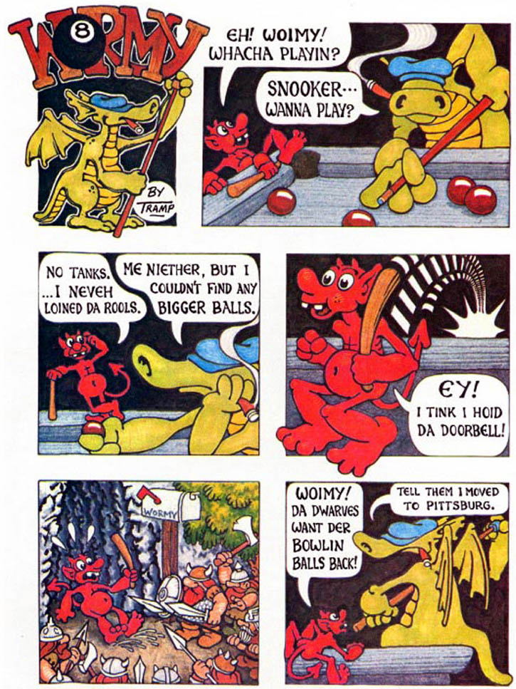 His Advanced Dungeons & Dragons cover and illustrations set the tone for TSR’s signature game; he also created a comic about — reasonably enough — a dragon for Dragon, the gaming magazine. “Wormy” ran through issue 132 of Dragon‘s print run before Trampier abruptly quit both the magazine and TSR both in 1988.