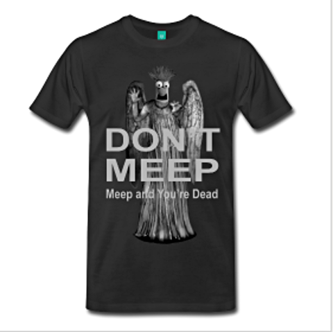 SCIFI.radio’s newest t-shirt design is exactly what it looks like: a Meeping Angel. It hits that sweet spot between Muppets and Doctor Who, and is a meme once seen cannot be unseen.