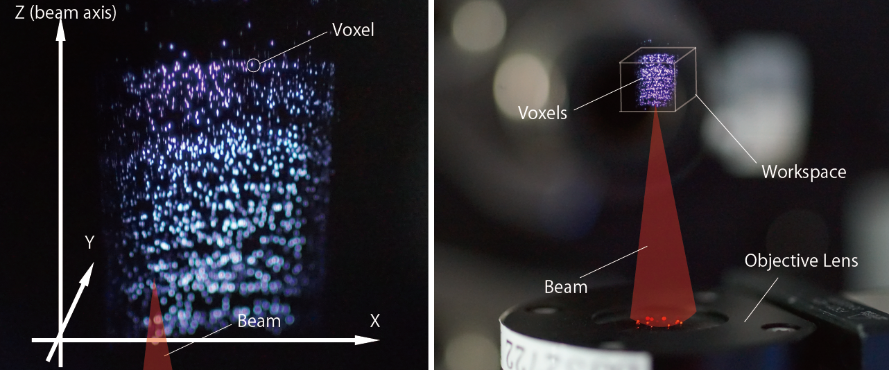 The following video is meant to explain what conference goers would see if they attended the presentation. The holograms presented are tiny, but it’s no less impressive for the size. Casually dubbed “fairy lights”, these images are produced in mid air by interference pattern convergence as controlled by tiny galvano mirrors. These are the same kind of little mirrors used in DLP projectors. The tiny points of light created are called “voxels”, which is short for “volumetric pixels”. The resolution of the device is measured both in spatial terms and temporal terms, in “voxels per second”.